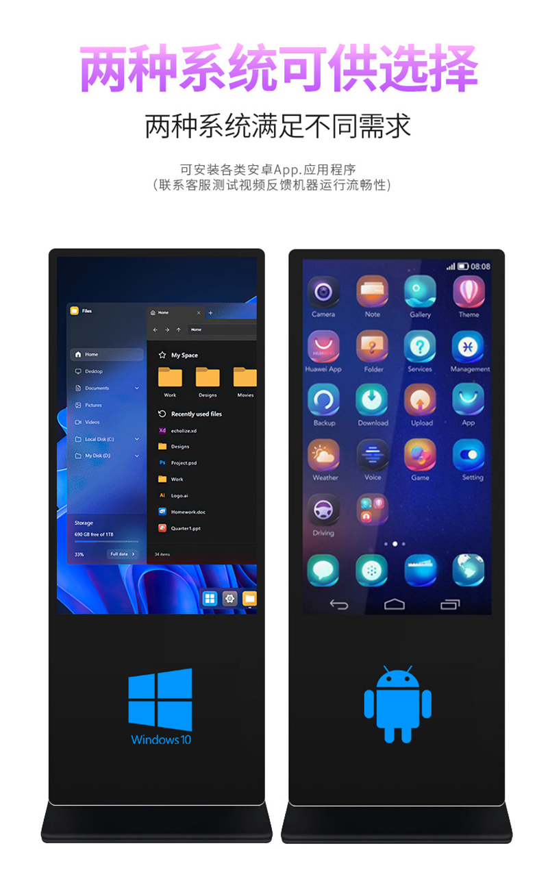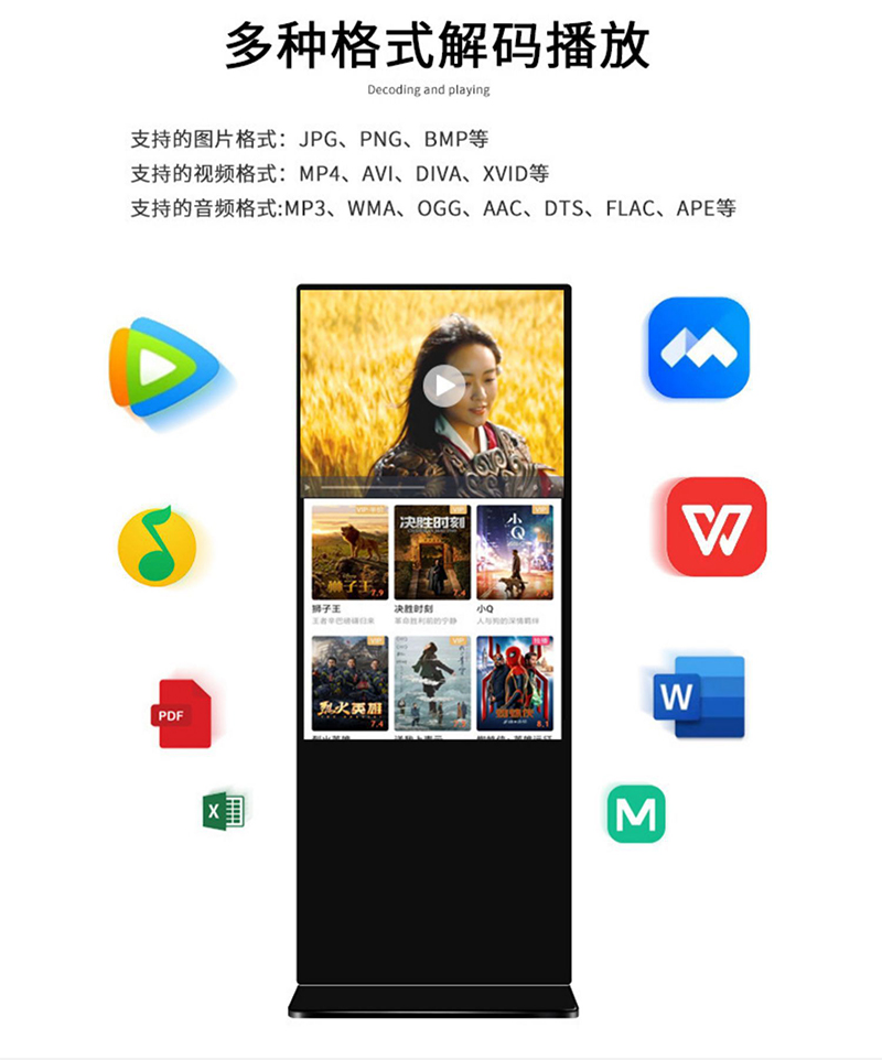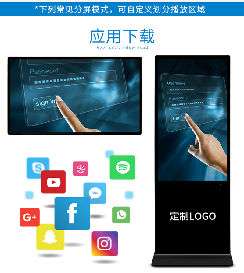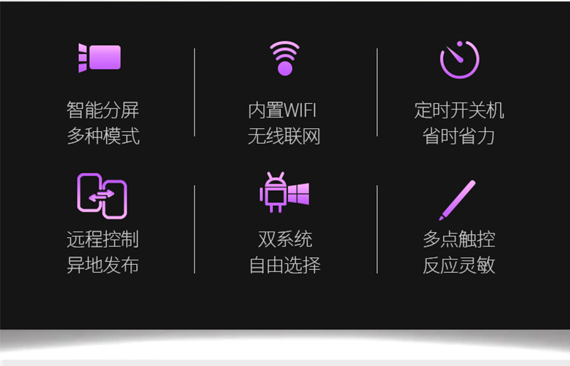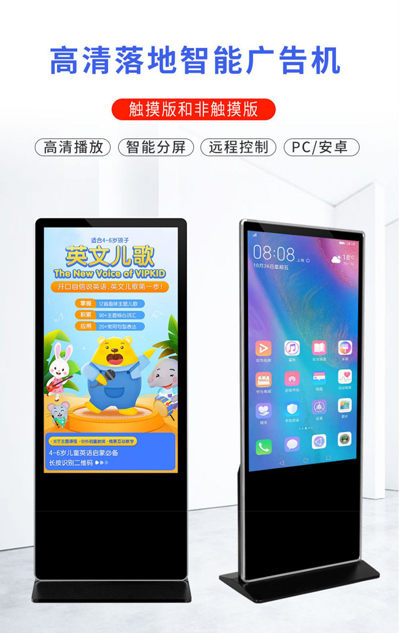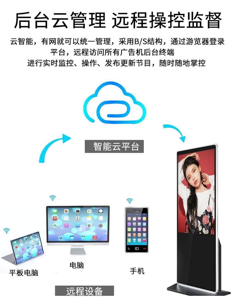 网络功能 :支持电脑 ,手机 ,笔记本 ,IPA 远程控制制作发布节目到机器上播放 ,图片 ,音乐 ,网址 ,文档,直播流 ,天气,分屏 ,滚动字幕等等,通电开机自动播放 ,无缝切换 ,循环播放 ,定时开关机.支持安装安卓开发的 APP 等功能的软件。