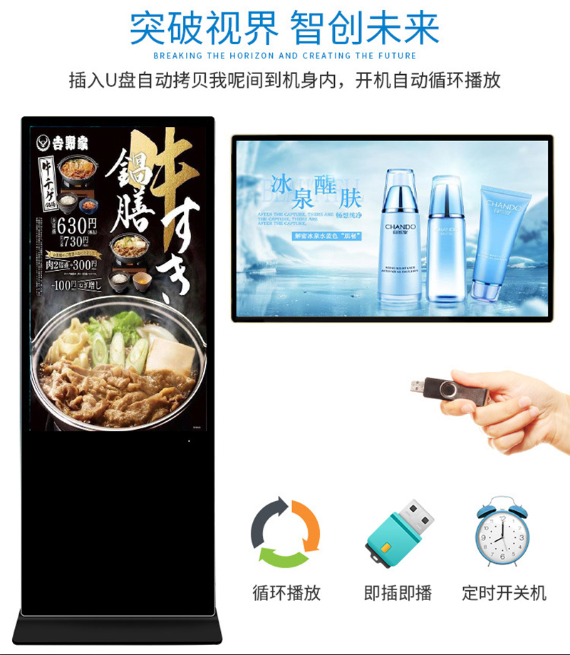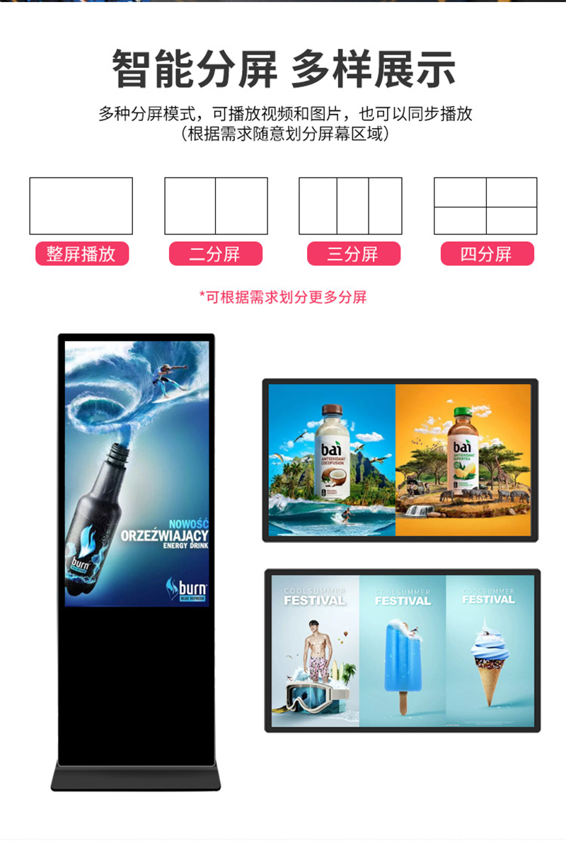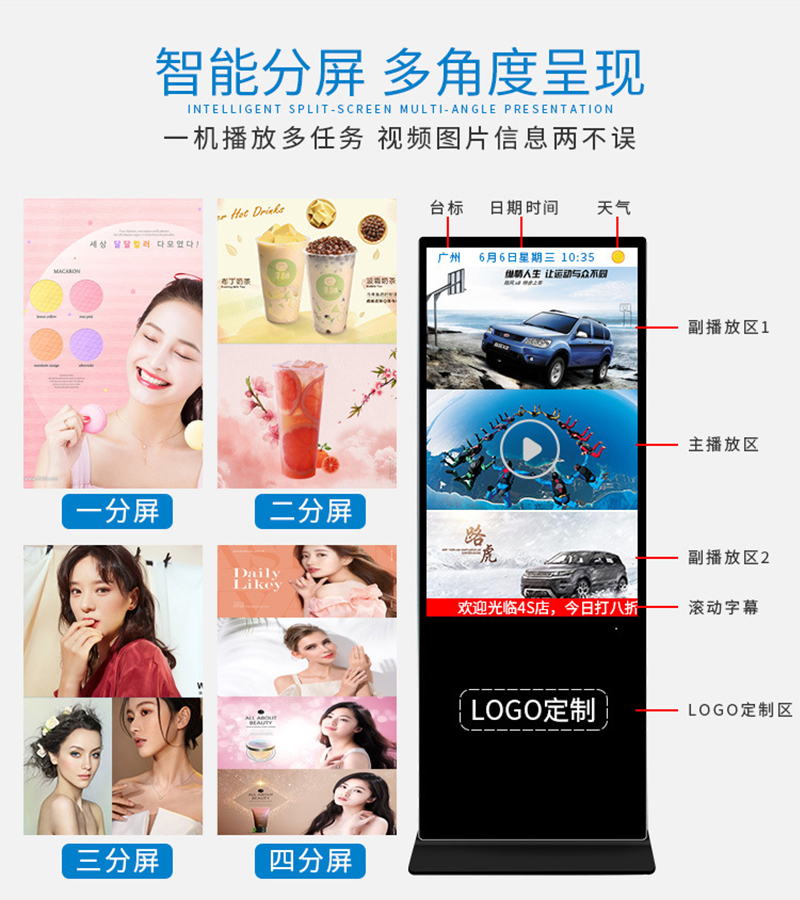 单机功能:插 U 盘,支持一键分屏 ,支持图片视频一键旋转 ,开机自动播放 ,无缝切换 ,循环播放 ,定时开关机等